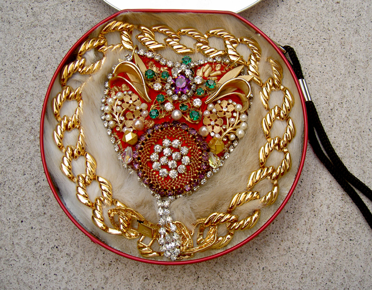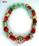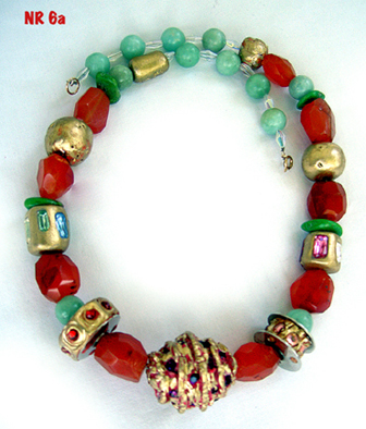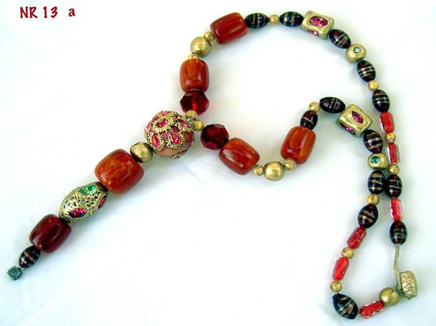 | Description: This exquisite, one of a kind, handmade necklace is made of vintage pieces sewn on to red and gold leather. Click image to supersize |