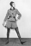 trousers, and in ‘64, he presented a collection of mini-shifts, bisected bi-colored outfits, with zigzags or